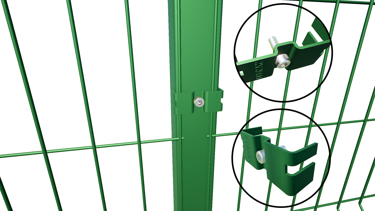 Применяются для монтажа сетчатой панели к столбу из профиля шириной 40, 60 или 80 мм. Глубина профиля столба не имеет значения.
