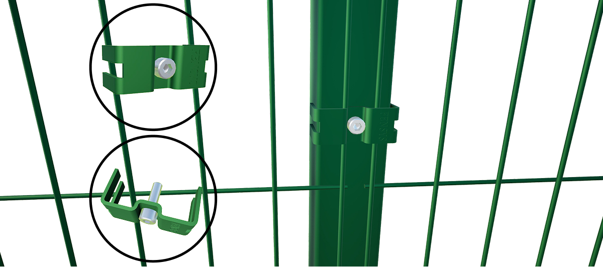 Крепежные элементы для монтажа сетчатых панелей к столбам- основаниям.