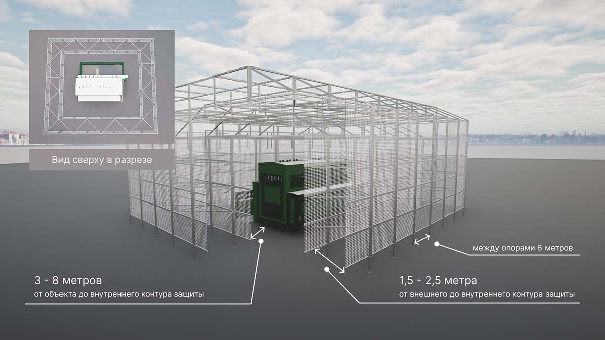 Купольный барьер обеспечивает защиту объекта, блокируя приближение дронов и предохраняя от воздействия взрывной волны и осколков. Эффективность системы достигается за счет значительной дистанции между объектом и барьером, а также высокой прочности конструкции. Стационарные укрытия доказали свою эффективность против таранных атак БПЛА, сброса и метания снарядов.